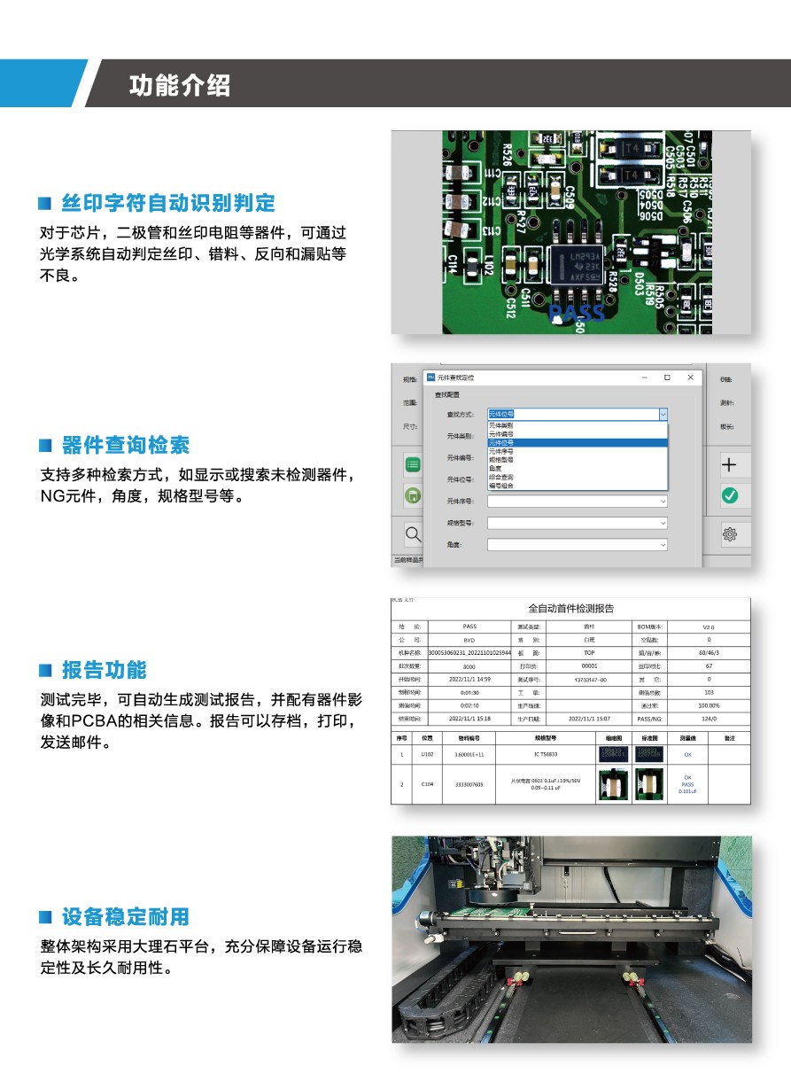 设备功能 | 自动测值、丝印、元件错、漏、反及多件检查 |
